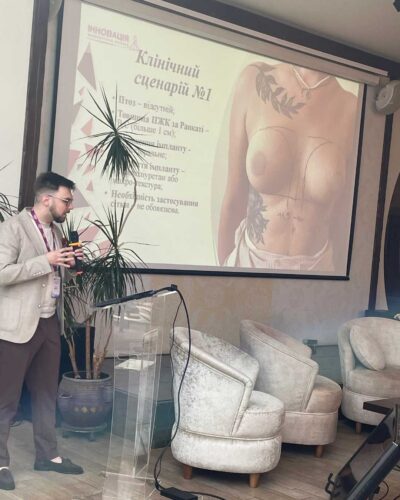 От клиники «Инновация» с докладом «Одномоментная реконструкция молочных желез имплантами» выступил Артем Федосов – доктор философии, онкохирург, руководитель маммологического центра клиники.